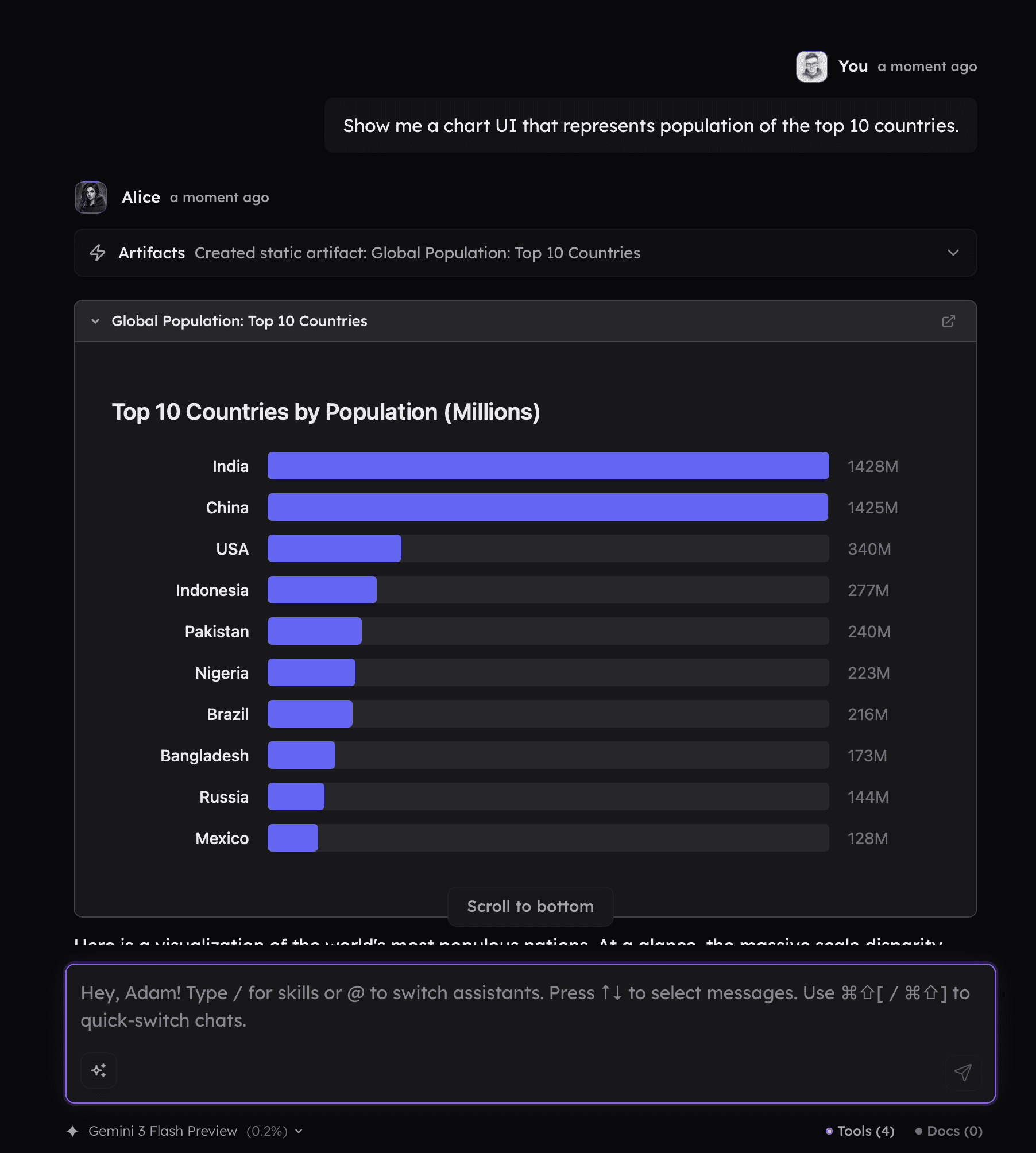 Artifacts is a built-in option within Alice for generating interactive blocks using HTML and JavaScript. Artifacts can be used to present data or create a simple interface for you to interact with.