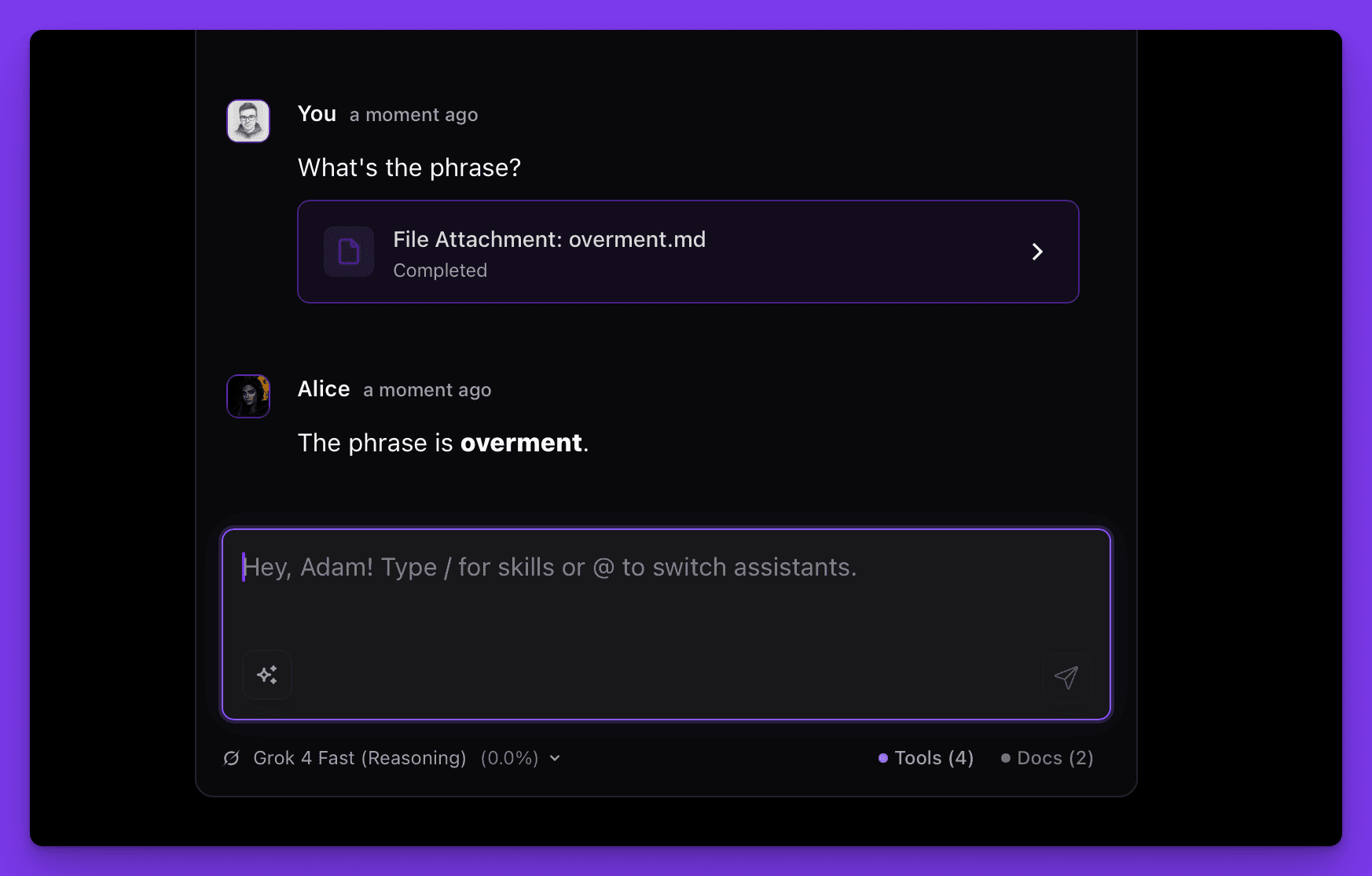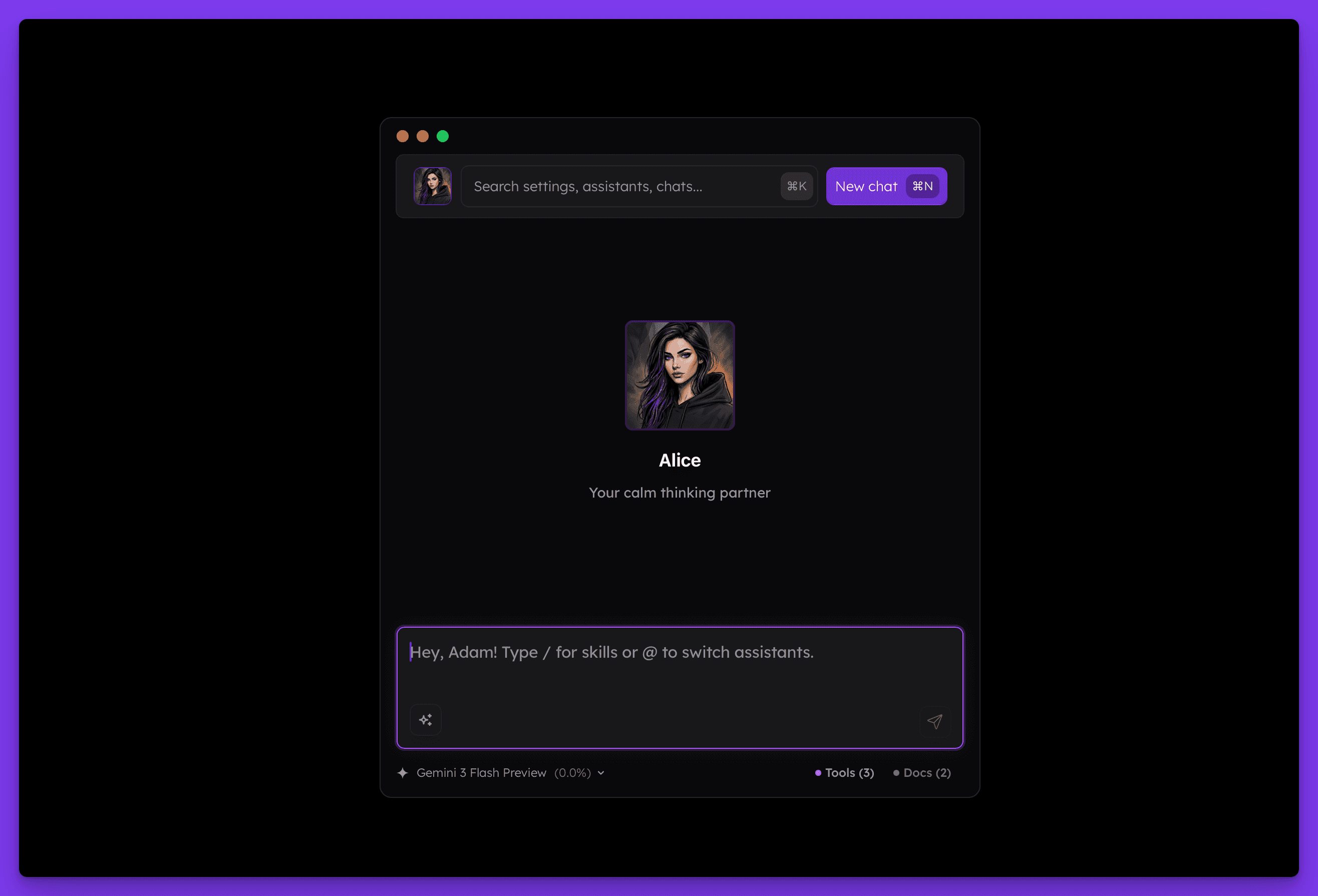 Sending a message provides a clear, generated answer. However, when you send a message, Alice builds context from the active agent's system instructions, tools, and enabled skills. Based on this context, the currently active model generates a result. When you send another message, the process restarts, so the way the model responds may change between turns. You can even change the model you are working with.