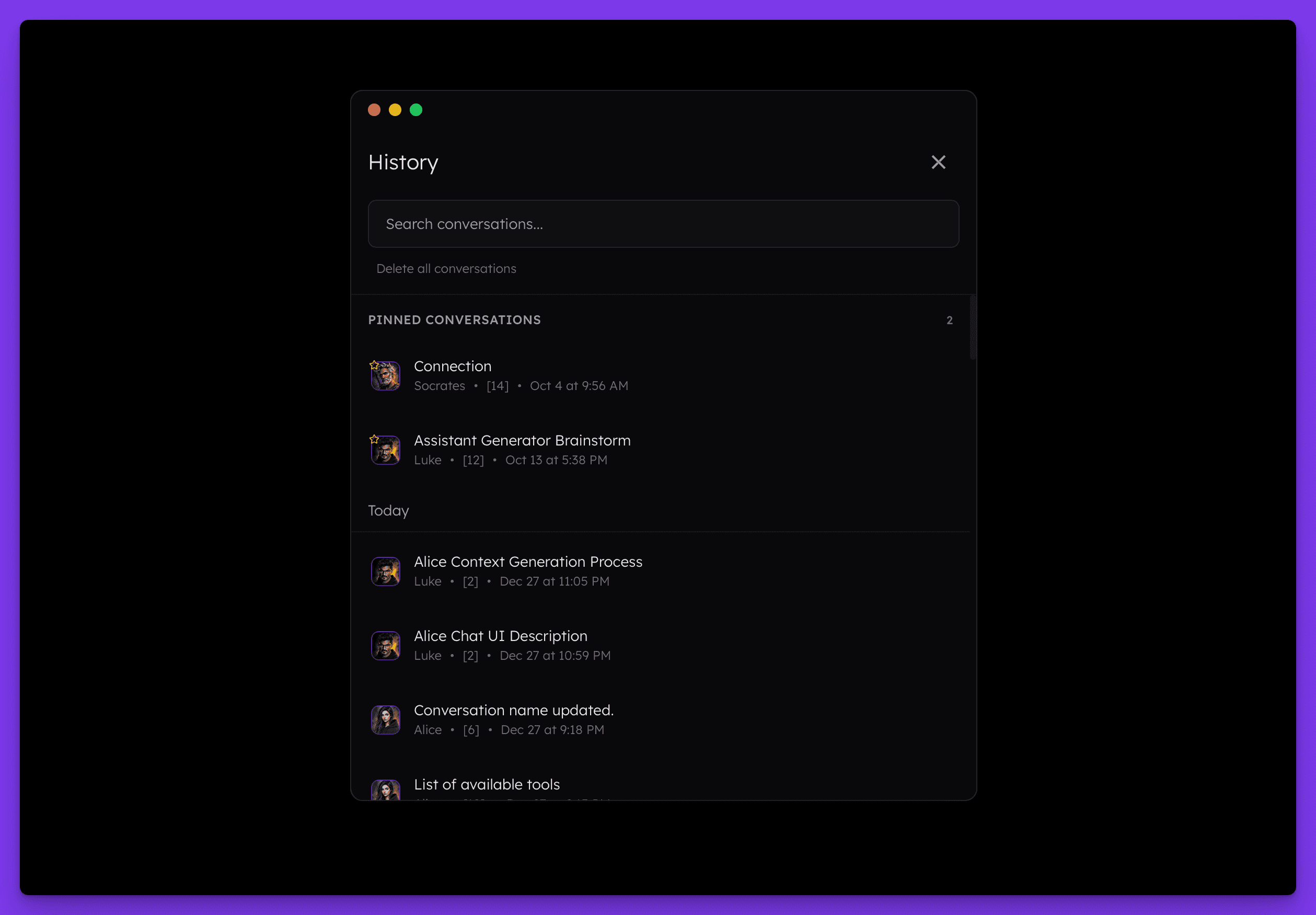 All your conversations are stored locally on your device until you choose to delete them. You can access them through the History panel by pressing Command + Shift + H (or Control + Shift + H). If you wish, you can pin specific threads to the top of the list. You can also search through threads, including both titles and their content, using the available search box.
