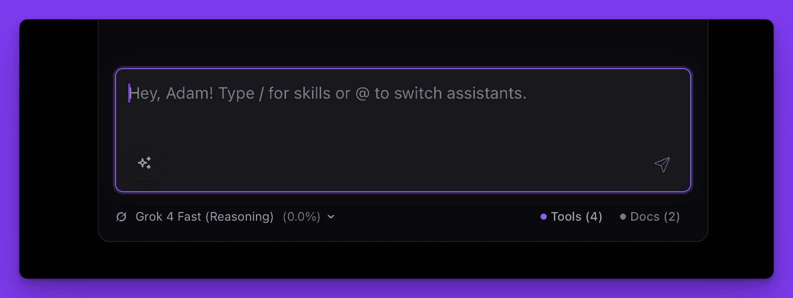 Near the main prompt input, you'll notice information about the currently active model. You can switch it by pressing Command + M and navigating with the arrows over the available models. On the right, there's information about the currently active provider and the available token limit for the current conversation. If you go beyond that limit, your requests will be rejected because of the model's limitations.