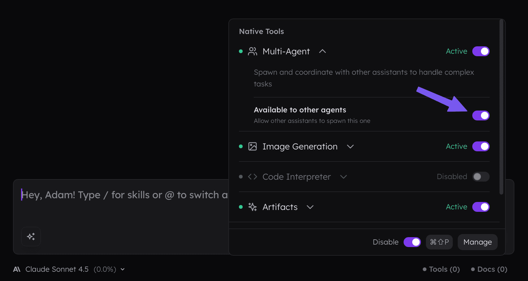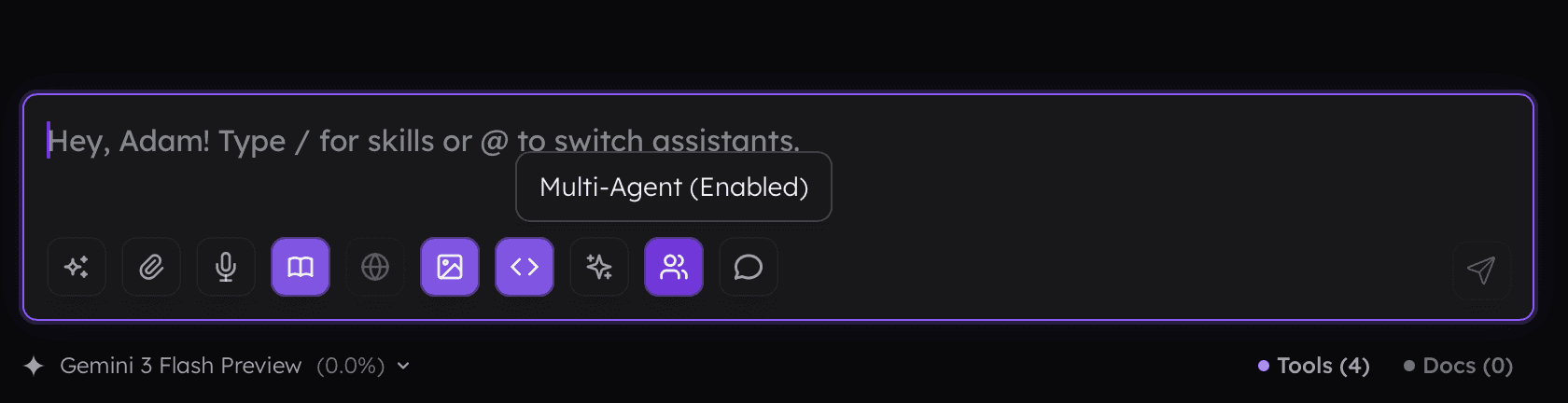 To enable multi-agent collaboration, use the button available within the prompt input.