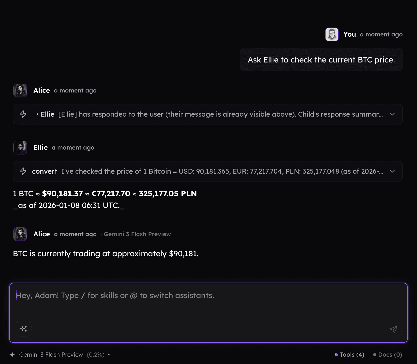 If you have more than one assistant, you can enable Multi-Agent mode to allow them to call each other based on their descriptions. Instead of relying on a single master assistant, you can utilize a team of specialists collaborating on a task.